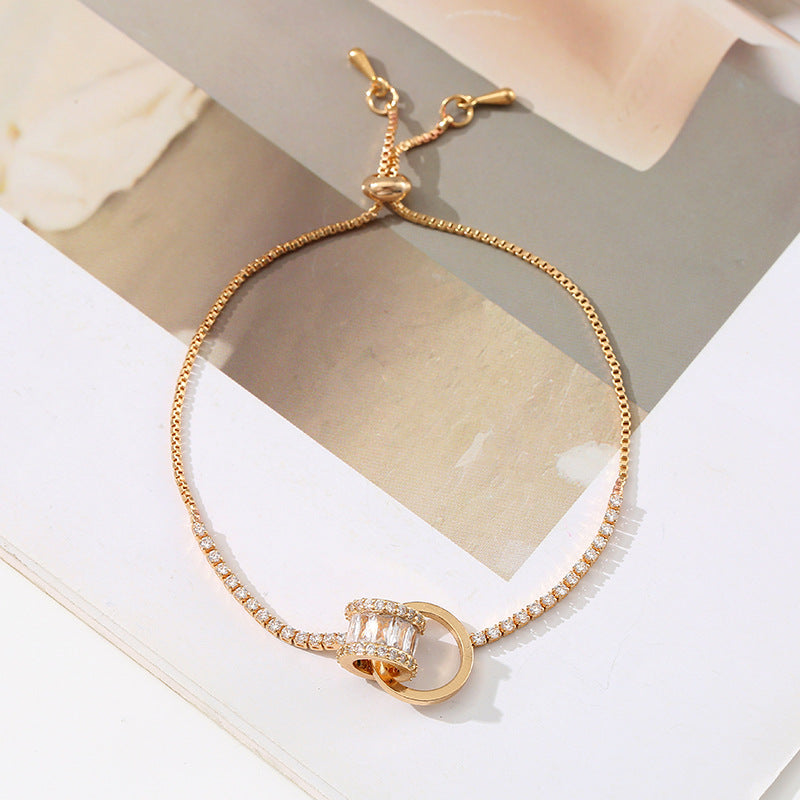 The sleek tennis chain is crafted with interlocking open circles, each centered by a sparkling cubic zirconia stone that creates continuous diamond-like fire. The lightweight, adjustable design drapes beautifully on the wrist – perfect for elevating office looks with quiet confidence, adding romance to date nights, or layering for weekend brunch when you want to feel effortlessly polished and radiant.