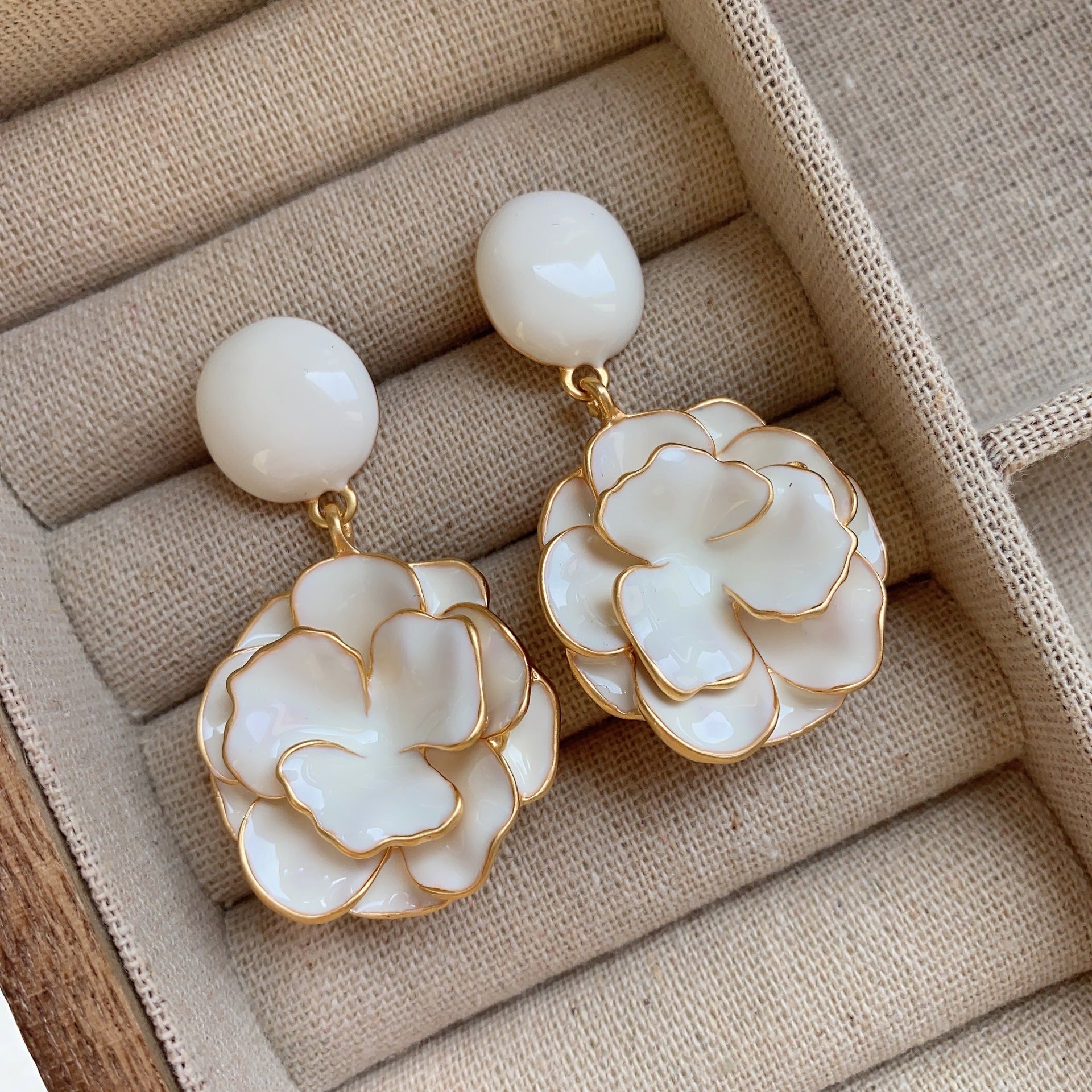 Cream Gardenia Enamel Flower Drop Earrings 18K Gold Plated Petal Dangle Earrings