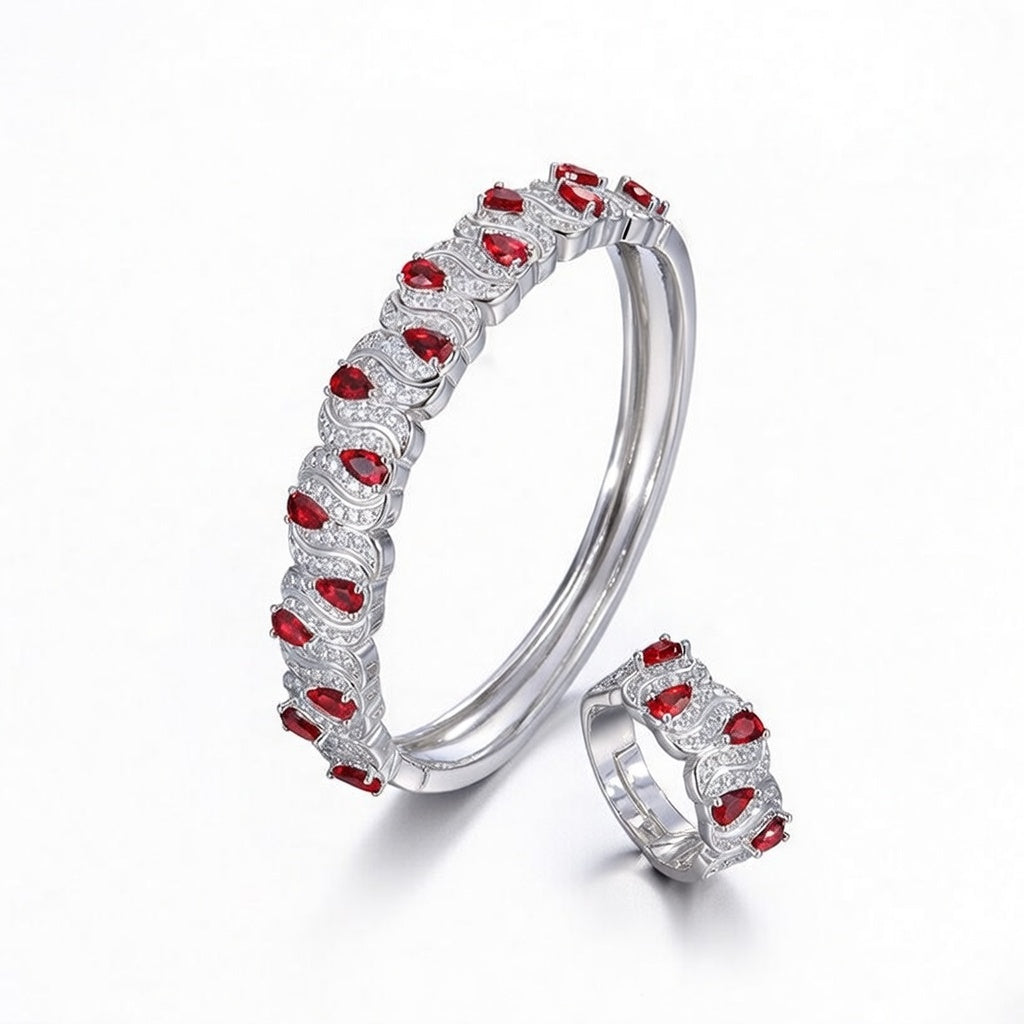 The fluid wave design flows gracefully around your wrist and finger, with vibrant emerald green stones nestled in sparkling pavé halos that catch light from every angle. Wear the bangle alone for sophisticated boardroom confidence, stack with the adjustable ring for evening glamour, or gift the set to celebrate milestones – each piece whispers timeless luxury and quiet power.