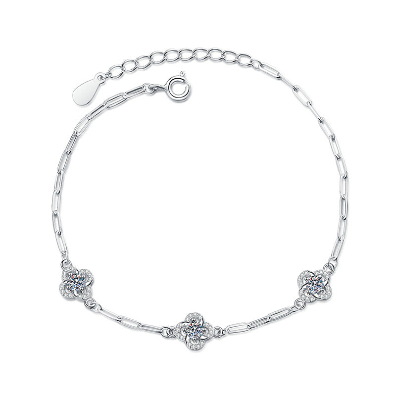 Three charming flower stations, each centered with a sparkling lab-grown moissanite stone and surrounded by petite moissanite petals, dance along a sleek S925 sterling silver paperclip-style chain. Lightweight and adjustable, it’s the perfect blend of floral elegance and everyday sparkle.