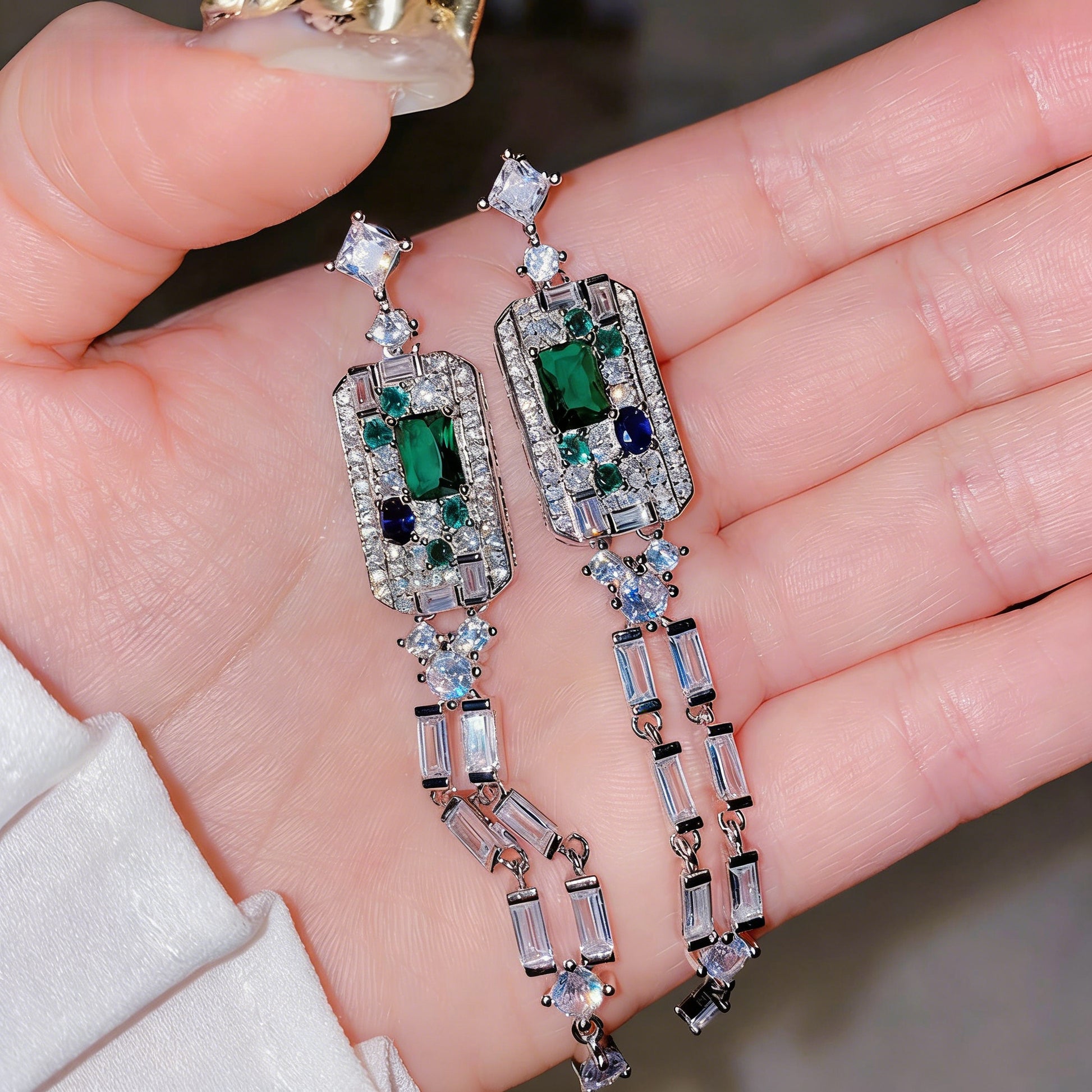 These stunning chandelier drop earrings feature vibrant emerald-colored gemstones accented with premium cubic zirconia (CZ) stones for unparalleled sparkle. Crafted in 18K gold, our high-quality AAAAA-grade CZ offers the brilliant fire and clarity of fine diamonds at an accessible price.