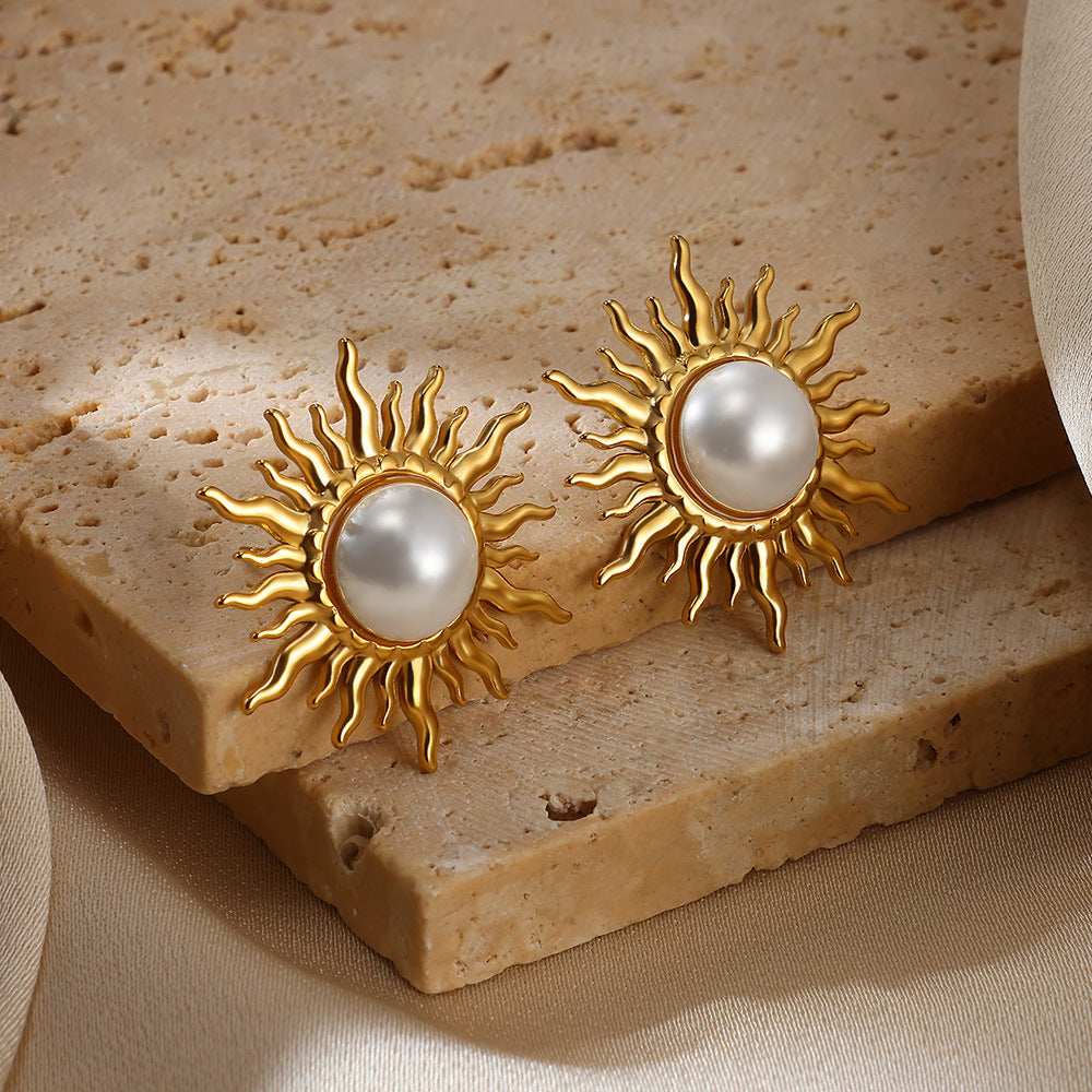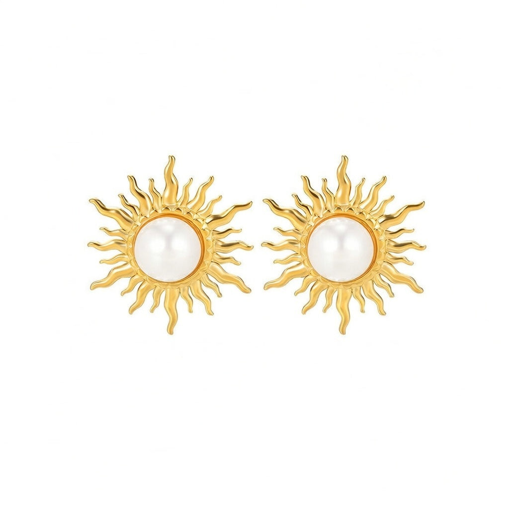 These radiant sunburst earrings feature a bold, sculpted sun design with a lustrous pearl at its core, blending celestial charm with timeless elegance—their polished finish and eye-catching silhouette add instant warmth and glamour to any look, day or night.